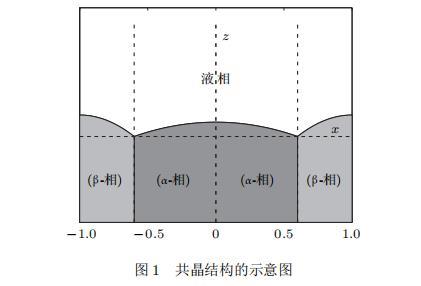 假设由α和β两相组成的片层共晶以拉度V向液相稳定推进,共晶片层与固-液界面垂直.选取固-液界面处α相片层的中心为坐标原点,x轴与片层垂直,z轴与晶体生长方向平行,如图1所示.共晶界面用函数z=h(x,t)表示,它也是共晶生长解的一部分.
