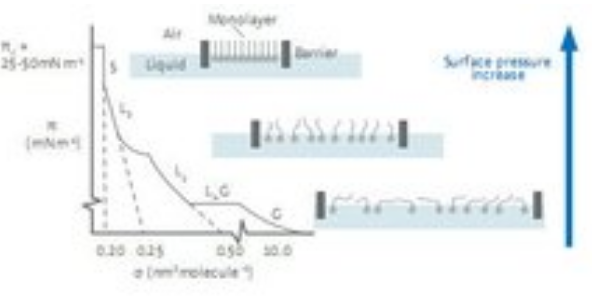 在进行典型的等温压缩测试时,单分子层先从二维的气相(G)转变到液相(L)最后形成有序的固相(S)。在气相中,分子间的相互作用力比较弱;当表面积减小,分子间的堆积更为紧密,并开始发生相互作用;在固相时,分子的堆积是有序的,导致表面压迅速增大。当表面压达到最大值即塌缩点后,单分子层的堆积不再可控(图1)。