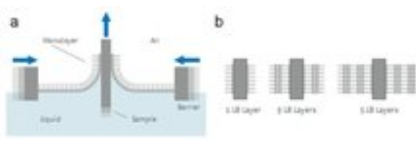 位于气-液或液-液界面处不可溶的功能性分子、纳米颗粒、纳米线或微粒所形成的单分子层可定义为Langmuir膜。这些分子能够在界面处自由移动,具有较强的流动性,易于控制其堆积密度,研究单分子层的行为。将材料沉积在浅池(称顶槽)中的水亚相上,可以得到Langmuir膜。在滑障的作用下,单分子层可以被压缩。表面压力即堆积密度可以通过Langmuir膜分析仪的压力传感器进行控制 。