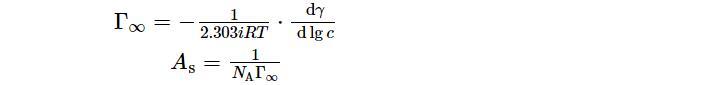 为了更全面地研究表面活性剂溶液性质,采用Gibbs吸附公式建立了表面吸附量和表面张力及活度之间的关系,根据表面活性剂表面张力变化曲线,可利用其得出表面饱和吸附量(Γ∞),由于表面活性剂溶液浓度很小,趋近于稀溶液,其活度可约等于浓度。再通过与阿伏伽德罗常数的数量关系,计算每个吸附分子在溶液表面所占的平均面积(AS)。因此可由如下公式计算: