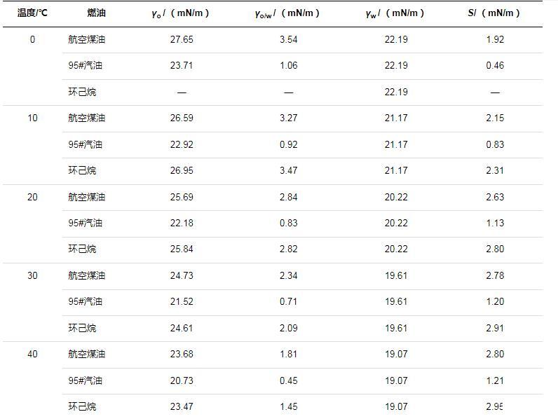 式中,S为铺展系数;γo为燃油的表面张力,mN/m;γw为表面活性剂溶液的表面张力,mN/m;γo/w为燃油与表面活性剂溶液之间的界面张力,mN/m。