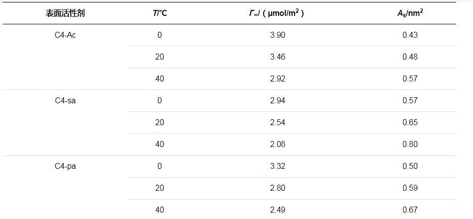 通常较高的Γ∞和较低的AS值表明表面活性剂分子密集地排列在空气与水的界面上,由上述公式计算得到三种表面活性剂的Γ∞和较低的AS值如表2所示。对比参数可知,同种表面活性剂的Γ∞均随温度的升高而减小,AS有所增大,吸附表面的分子排布较为松散。这是由于温度较高的情况下表面活性剂分子热运动加剧,更易从吸附界面上脱离,并且因无规则运动导致吸附分子所占面积增大了。温度升高导致溶解度的增加,因而表面的Γ∞会有所减小。由于Γ∞还受到表面张力随浓度变化曲线斜率的影响,因此所得趋势是综合影响的结果。此外,由表中还可以看出,C4-sa分子的Γ∞最小,AS最大,在溶液表面的排列更加松散。这可能是由于亲水端磺酸基团之间强静电排斥力,并且空间位阻较大。