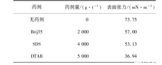 在浮选精煤过滤阶段,滤饼中存在较强的毛细作用,水分难以排出。降低液相的表面张力可从根本上降低毛细力,使大量的毛细水从煤粒的间隙中排出。试验对不加药及3种药剂最佳用量时滤液的表面张力进行测定,结果见表6。从表6可以看出,在不加药时滤液的表面张力最高,为73.75 mN/m,比水的表面张力72.75 mN/m略高,其原因可能是浮选精煤表面残留的浮选药剂进入了滤液。在添加了表面活性剂后,3个滤液样品的表面张力均有不同程度的下降。其中,添加Brij35的滤液表面张力较高,为57.00 mN/m,添加了SDS的滤液表面张力略低于Brij35,为53.13 mN/m,而添加了DTAB的滤液表面张力最低,仅为36.94 mN/m。表面张力的降低可显著促进煤颗粒间毛细水的脱除。