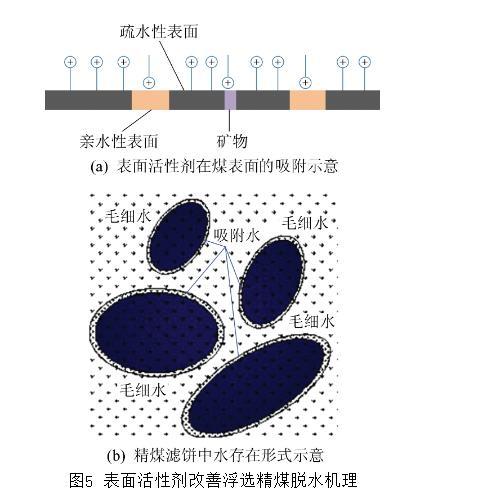 表面活性剂在煤表面的吸附可由图5a解释,亲水基团主要与煤表面矿物质或煤亲水性表面发生吸附,疏水基团主要与煤表面疏水位点发生吸附。由于本次研究煤样为炼焦煤精煤,其表面以疏水为主,这导致大部分表面活性剂的疏水基团与煤表面疏水区域发生吸附,使得表面活性剂亲水基团暴露在外,因此煤表面亲水性增加。煤表面亲水性增加虽然会使煤表面水化膜变厚,吸附水能力增加,但该作用与表面活性剂促进毛细水的脱出效应相比较小(图5b)。因此,表面活性剂的存在虽使煤表面亲水性上升,但使水的表面张力大幅降低,从而使煤粒间隙中的毛细水更容易在压力的作用下排出,因此表面活性剂在此研究中降低了精煤滤饼中的水分。