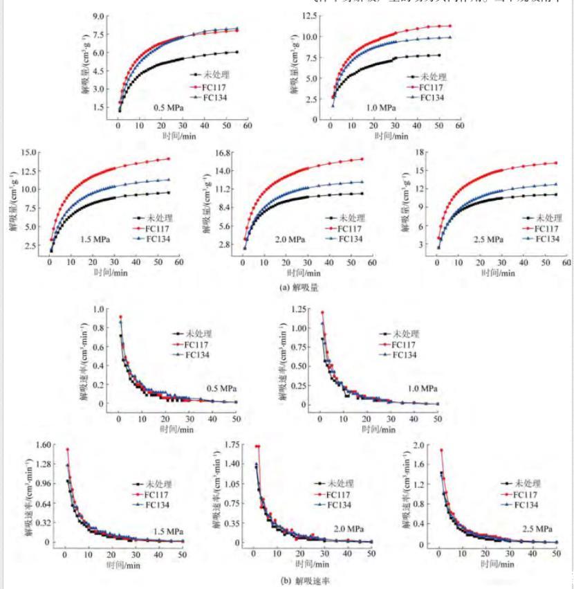 为了得到气润湿反转剂处理前后含水(1%含水率)煤样的解吸规律,依次对不同吸附平衡压力条件下的煤样进行解吸试验,通过对比干燥与含水煤样的解吸量和解吸速率,进而定量分析气润湿反转剂消除水锁效应,如图6所示。