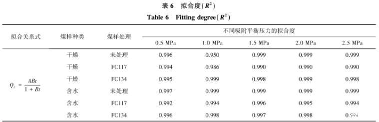 由表6可知,利用王佑安式拟合不同平衡压力条件下的解吸量与时间关系曲线,得到曲线的拟合度。其中,气润湿反转剂处理前后含水煤样的拟合效果最好,拟合度均大于0.99。在干燥煤样中,FC134处理后的煤样拟合度最好,不同吸附平衡压力条件下的拟合度均大于0.99;其次是未处理和FC117,拟合度也比较好,除去未处理煤样中吸附平衡压力为1.0 MPa,其余均在0.98以上。