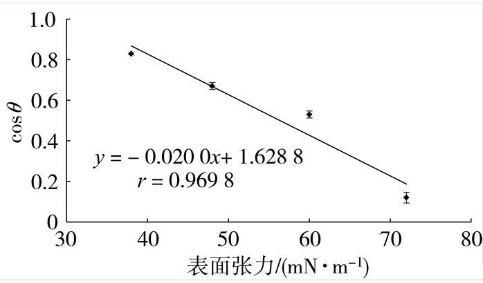 叶片临界表面张力直接影响药液在叶片表面的沉积特性,临界表面张力越小越不利于药液雾滴的沉积、润湿和展布。测试液的表面张力与cosθ间呈显著负相关关系(图3),其拟合方程为y=0.020 0x+1.628 8(r=0.969 8),其中x为表面张力,y为cosθ。根据拟合方程计算得到烟草叶片的临界表面张力为31.44 mN/m。与王亚虹等和陈海涛等测定的K326和云87两个烟草品种相近,表明不同烟草品种叶片临界表面张力值差异不大,且明显低于小麦、棉花和茄子等,说明普通农药雾滴不容易在烟草叶片表面润湿和展布,因此需要合理使用助剂降低农药药液的表面张力至低于烟草叶片临界表面张力。