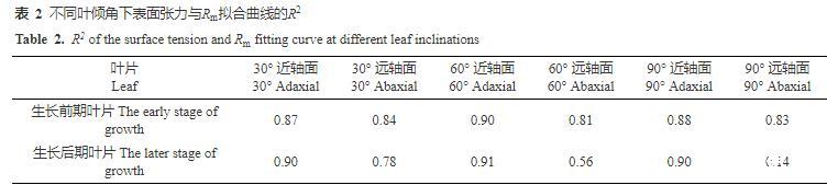 由表2结果可知,苹果叶片生长前期近、远轴面和生长后期近轴面,不同叶倾角下表面张力与Rm值拟合曲线的R2均高于0.80。而苹果叶片生长后期远轴面除30°时R2高于0.7外,其他叶倾角下均低于0.6,且随着叶倾角增大,R2不断减小,这表明苹果叶片生长后期远轴面的表面张力与Rm值之间的线性关系较差。