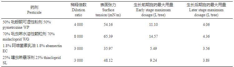 基于2.3节中表面张力与Rm值之间的关系,选取4种常用农药制剂(50%吡蚜酮可湿性粉剂、70%吡虫啉水溶性颗粒剂、1.8%阿维菌素乳油和25%噻虫嗪悬浮剂),测定其最大表面张力,结合果树常用冠层参数(平均叶倾角、叶面积指数等)对果树施药用量进行预测评估,从而为大容量果树精准用药提供理论基础。