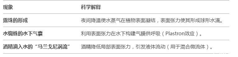 水的表面张力是由水分子间氢键作用产生的独特性质,它在自然界和科学技术中表现出多种有趣的现象。以下是水表面张力的主要现象及其解释: