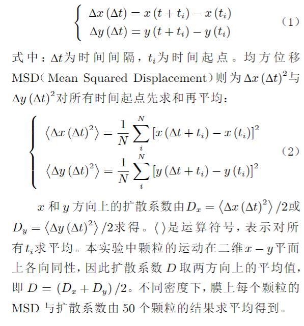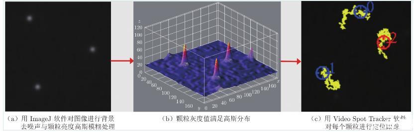 实验采用Olympus显微镜(配备60倍物镜)观察颗粒在膜上的布朗运动,同时利用电子增益高速摄像机(Andor 897 EMCCD)进行拍摄。每个视频拍摄时间为200 s,帧频为0.05 s,曝光时间5 ms,图像尺寸为300像素×300像素,分辨率为0.26µm/m。采集原始图像中的颗粒灰度值不符合标准高斯分布,因此使用图像处理软件ImageJ对图像进行背景去噪声(Background Subtraction)和高斯模糊(Gauss-ian Blur)处理(图3(a)),使颗粒灰度值达到标准高斯分布(图3(b))。之后用Video Spot Tracker软件定位每个颗粒的灰度峰值(图3(c)),即颗粒质心,定位误差仅为0.5像素,进而对颗粒二维运动轨迹(平面)进行实时跟踪。软件自动将颗粒在每一时刻的像素位置坐标存入计算机中,使用MATLAB计算颗粒在不同时间间隔Δt内沿和方向的位移,计算公式如下: