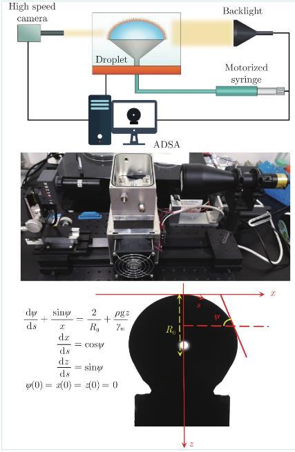采用课题组自主研发的约束液滴表面测量仪(Constrained Drop Surfactometry,CDS)测量膜在不同密度下的表面张力,如图1所示,图中x与z分别代表水平与竖直方向,s代表液滴表面切向方向,ψ为液滴表面与水平方向内夹角,R0为液滴半径,ρ为液滴密度,g为重力加速度。CDS上的圆形基座用于盛放纯水液滴(约10µL),以微量进样针将稀释的固尔苏–氯仿溶液滴定到液滴表面,形成形状类似于肺泡的水‒气界面固尔苏肺表面活性剂膜。基座中央的小孔通过导管与注射器相连,注/抽水速度由Labview编程的推进器控制,以此调节液滴表面积的变化速率。实验测量的是膜在压缩过程中表面张力与膜密度变化的关系,液滴表面积以0.05的准静态速率缩小。液滴的轮廓由照相机拍摄。膜表面张力和表面积以ADSA(Axisymmetric Drop Shape Analysis)方法分析得出。膜表面压强,其中,纯水表面张力。