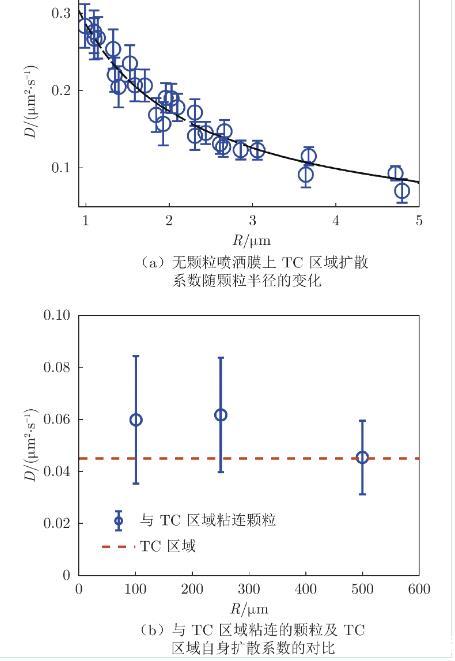 均为常数,取自文献。肺表面活性剂单层膜厚度为1 nm,由此可得膜的体黏度为0.77 Pa·s,是纯水黏度的770倍。图9(b)将与TC区域粘连的颗粒的扩散系数(以圆形表示)与单独TC区域的扩散系数(以虚线表示)进行了对比,后者选取3.5µm为平均TC区域直径(参照图2照片),由HPW模型代入计算得出。可以看出,在实验统计误差范围内,二者近似相等,表明颗粒与TC区域形成的整体受力主要来自于TC区域。TC区域直径远大于颗粒直径,膜内黏滞阻力更大;此外,膜的体黏度远大于水相,因此水相对颗粒浸没部分施加的黏滞阻力可忽略不计。