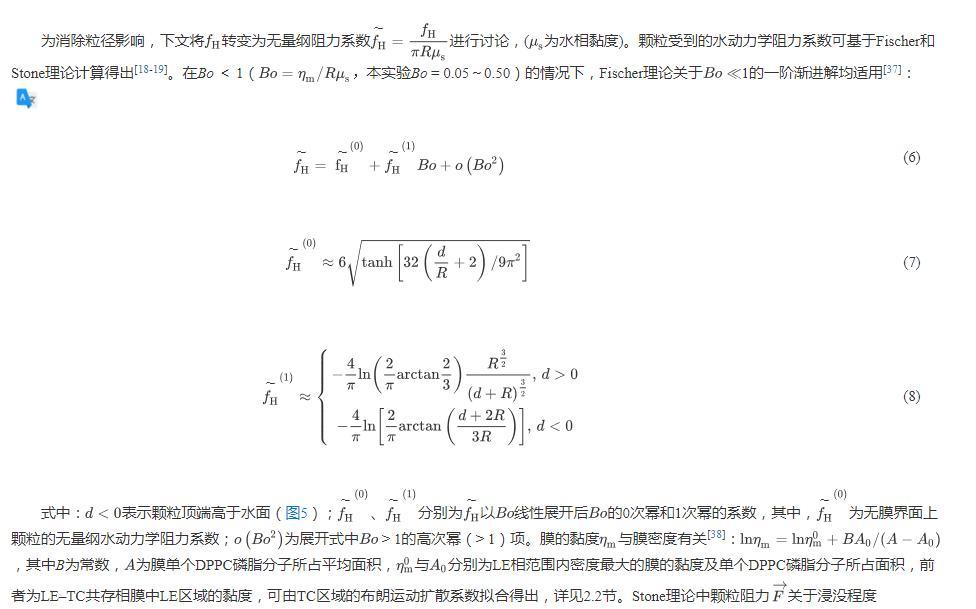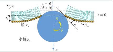 颗粒的水动力学阻力系数取决于颗粒在水相中的浸没程度(图5,以颗粒暴露在空气中的高度d表示)。颗粒的平衡位置取决于重力、浮力及膜施加的表面张力。重力G为: