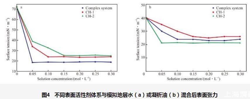 图1单一表面活性剂体系与模拟地层水(a)或凝析油(b)混合后的表面张力