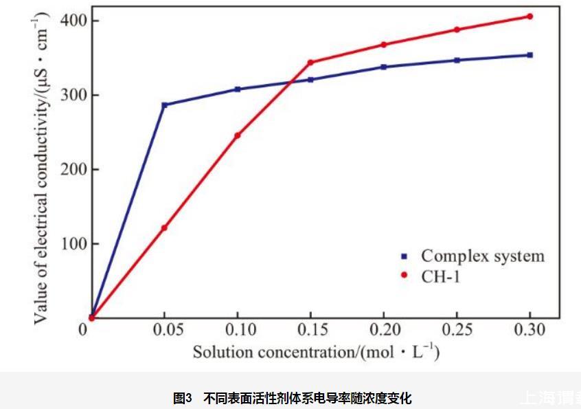 由图3可看出,两种表面活性剂的电导率均随浓度的增加呈先迅速增大后缓慢增长的趋势。这是因为表面活性剂浓度低于cmc时,表面活性剂主要以单体形式存在,单体中的离子可在溶液中自由移动,从而增加了溶液的导电能力;当表面活性剂浓度高于cmc时,一部分离子被包裹在胶束内部,使得自由移动的离子数量增加幅度减小,远小于浓度低于cmc时电导率随浓度增加的幅度。阳-非离子复合表面活性剂电导率转折点时的浓度低于CH-1电导率转折点时的浓度。这是因为复配后,离子型表面活性剂的离子头基与非离子表面活性剂的极性头基之间可通过静电引力、离子-偶极等作用相结合。这种相互作用增强了表面活性剂分子在界面上的吸附能力和在溶液中的聚集能力,使得形成胶束所需的浓度降低,即cmc减小。