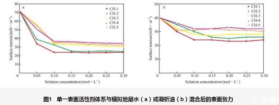 单一表面活性剂(CH-1,CH-2,CH-3,CH-4,CH-5)体系与模拟地层水或凝析油混合后的表面张力测定结果见图1。