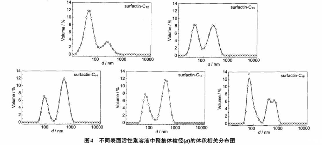 图4不同表面活性素溶液中聚集体粒径(d)的体积相关分布图