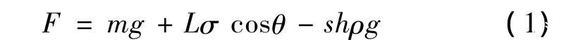式中:F为平衡力,N;m为感测白金板的重量,kg;s为感测白金板横截面面积,m2;h为浸入待测溶液的深度,m;L为感测白金板周长,m;σ为待测溶液的表面张力,mN/m;g为重力加速度,N/kg;θ为待测溶液和白金板的接触角,°;ρ为待测溶液的密度,kg/m3。