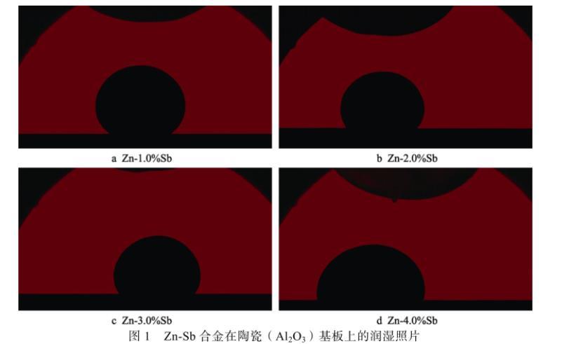液态金属表面张力是一个极为重要的物理化学性质,在液态金属成形加工过程中,表面张力与金属的流动性及其与金属基板间的润湿性密切相关。由于合金熔体与陶瓷的不润湿性,可以通过计算得到较准确的合金熔体表面张力,并进行不同Zn-Sb合金熔体在陶瓷(Al2O3)基板上的润湿实验,图1为实验条件下不同Zn-Sb合金熔体在陶瓷基板上的润湿照片。