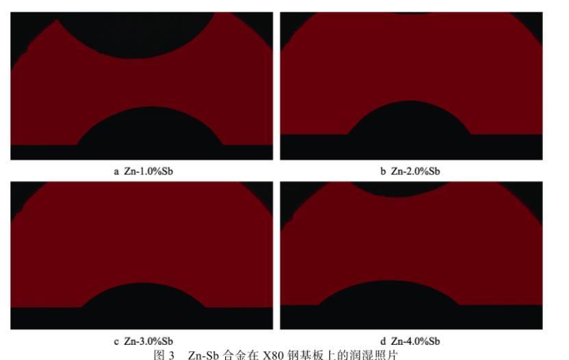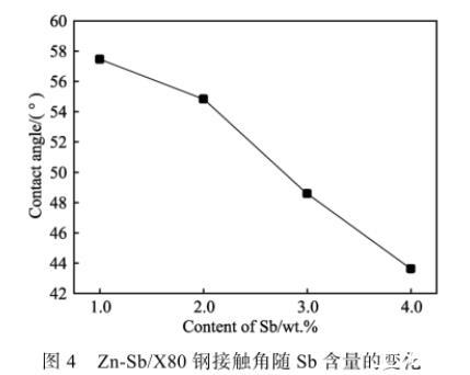 在实验过程中,锌合金熔体在基板上的润湿时间很短,润湿体系会很快达到平衡,且锌合金熔体中Sb元素的添加量很少,根据Fe-Sb二元相图可知,在450℃滴落温度下,Fe与Sb之间的固溶度极小并无化合物生成,与X80钢基板发生反应的元素主要是Zn,可以认为Sb添加对降低锌液与X80钢基体之间界面张力σsl的影响相对较小,由此Zn-Sb合金熔体与X80钢基板之间的润湿角主要取决于锌合金熔体的表面张力σlv,表面张力σlv越小,接触角越小,即锌合金熔体与X80基板之间的润湿性越好。