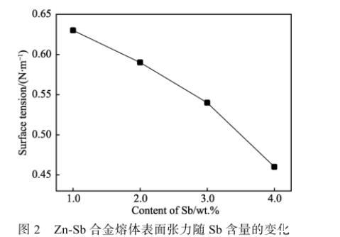 1)Sb的添加能显著降低锌液表面张力,且合金熔体表面张力随Sb含量的增大而减小。当Sb质量分数为1.0%时,锌合金熔体表面张力为0.63 N/m;Sb质量分数增加到4.0%时,表面张力达到最小,约为0.46 N/m。