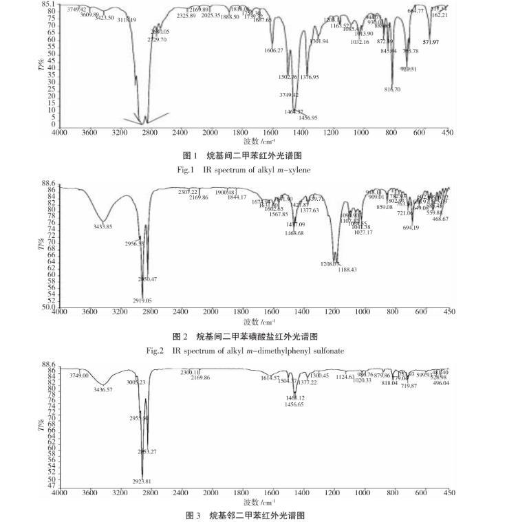 以烷基间二甲苯和烷基间二甲苯磺酸盐为例说明。在波数为2924、2853、1464cm-1附近是-CH2-,-CH3的拉伸及弯曲振动;在波数为818cm-1处的峰,符合六元芳环中1,2,5-三取代特征峰;波数为1606、1502、1464cm-1是芳环的C=C骨架振动峰,以上说明有芳环存在,并且取代位置符合所预设的苯环上的取代位置。在1376cm-1是CH3的变形对称振动峰;在721cm-1处是C-(CH2)n-C(n>4)的骨架振动峰,说明有长烷烃链的存在。预设结构分子的特征峰均存在于此红外光谱图中。相应的的磺酸盐的傅里叶红外光谱图上(见图2),-CH2-,-CH3的拉伸及弯曲振动峰几乎不变,磺酸根的特征峰是1208,1188cm-1处的1个双头强峰和1027cm-1附近的中强窄峰。综上所述可知,所合成的产品符合烷基间二甲苯和烷基间二甲苯磺酸盐的结构特征。