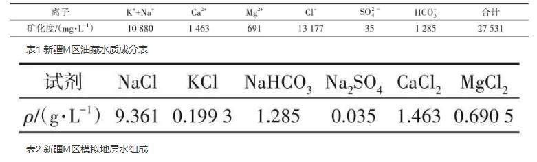油藏水质成分见表1,模拟地层水组成如表2所示。