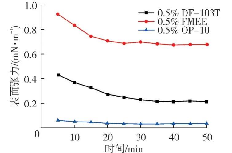 测定0.5%的DF-103T、OP-10、FMEE这3种非离子表面活性剂的表面张力,结果见图2。