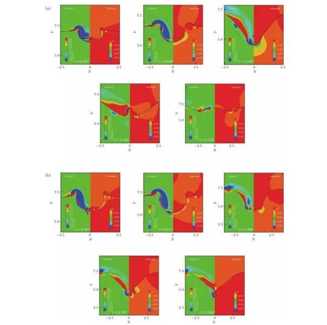图9不同时间节点下水滴撞击深水液池空腔运动的涡量场和压力场等值线图
