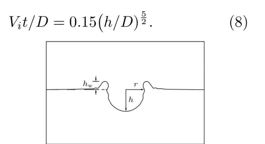 3)液滴撞击深水液池后,空腔深度先以较快速度增长,在到达最大空腔深度后快速回弹,至接近原自由液面后速度逐渐放缓。在忽略毛细波作用、空腔深度为h=D至h=hmax范围内的前提下,空腔深度随时间的成长关系可由(Vit)/D=0.15(h/D)5/2来描述,但最终空腔底部的形成是由毛细波运动决定的;空腔宽度的增长主要由毛细波运动及其干扰驱动,最后在惯性力作用下线性增长。