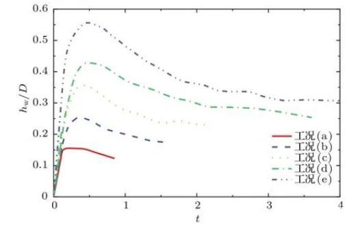 图7不同工况下波浪隆起高度随时间的变化