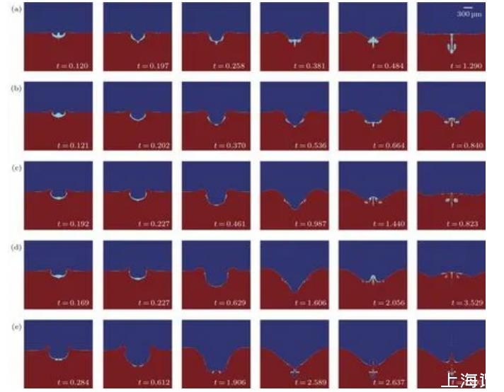 上述水滴撞击水池的过程可以归纳为三个基本阶段,第一阶段为空腔的形成与膨胀;第二阶段为毛细波传播导致的空腔收缩;第三阶段为空腔的回复。液滴撞击深水液池时的运动分为完全聚结与部分聚结现象,在水滴与深水液池完全聚结时,水滴入水时由于水滴底部发生凹陷变形产生的气泡夹带随着撞击速度的增加而减小,而在部分聚结发生时气泡的夹带与截留行为则更为复杂。
