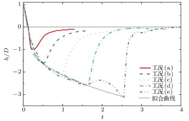 图6为不同工况下空腔深度h随时间的变化过程。由图6可以看出,液滴撞击深水液池后,由于动能、空腔侧壁隆起部分重力势能以及表面张力能的驱动,空腔深度先以较快速度增长,其后增势逐渐放缓,在到达最大空腔深度后快速回弹,至接近原自由液面后回弹速度逐渐放缓,近乎趋于直线。弗劳德数的增加对空腔深度变化影响显著,在工况(a)中,弗劳德数仅为117.2,空腔能量耗散时程较短,回复较为迅速,随着弗劳德数的增大,撞击动能增大,回复时程也逐渐增加。值得注意的是,在工况(e)中,由于空腔形状由U形转变为近似梯形,空腔在t=1.5—2.6时先缓慢上升,随后毛细波向空腔底部传递,促使其底部变为圆柱形,且深度继续增加,最后空腔底部侧壁坍塌形成射流,因此在t=2.6后空腔回复速度较其他工况更为迅速。将数值结果运用最小二乘法拟合,得到的拟合曲线表达式如(8)式所示,该式能够在忽略毛细波运动的前提下,在空腔深度为h=D至达到最大深度的范围内较好地描述了空腔深度随时间的成长关系,Liow等与Ray等对液滴撞击运动中时间与空腔深度的关系进行了建模,得出与本文相似的结论: