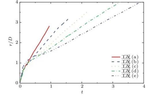 图7及图8分别为不同工况下波浪隆起高度hw和空腔宽度r随时间的变化过程。由图7易得,水滴撞击水池后波浪高度的变化过程也经历了从快速增长到逐渐回落,最终在惯性力的作用下自主运动,趋于稳定的过程。随着弗劳德数的增大,更大的垂向速度在创造更深空腔的同时激发了更高的最大波浪隆起高度。从图8可以看出,空腔宽度的增长与波浪的运动息息相关,在撞击产生的动能与波浪自身重力势能基本耗散后,空腔运动主要由毛细波及其干扰驱动,最后在惯性下线性增长。毛细波现象在图8工况(e)的t=0.8时非常显著,其周期在图6的t=1.5—2.5中也有体现。