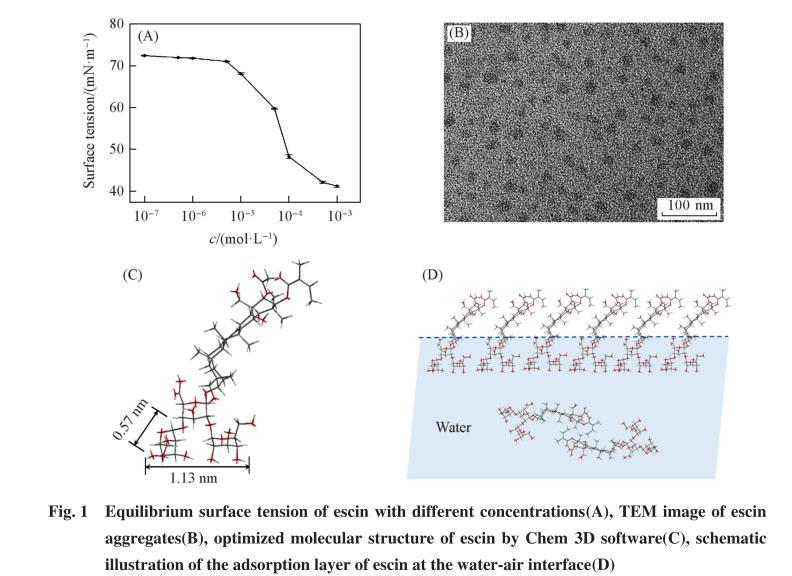 首先,采用吊片法测量了不同浓度七叶皂素溶液的表面张力.由于七叶皂素溶解度的限制,当浓度超过1×10-3mol/L时会有少量固体物质析出,影响测试结果,故表面活性测试的浓度范围为1×10-7~1×10-3mol/L.如图1(A)所示,随着七叶皂素浓度的增加,表面张力呈现先基本不变、后快速下降、最后达到平衡的3个阶段.这是由于浓度低于1×10-5mol/L时,只有少量七叶皂素分子吸附在气-液界面,表面张力基本不变;然后随着浓度增加,越来越多的分子迁移并吸附在气-液界面,使溶液表面张力快速下降;当分子在界面吸附达到饱和(5×10-4mol/L)后,开始在体相聚集形成胶束,表面张力不再改变.可知,七叶皂素的临界胶束浓度(cmc)为5×10-4mol/L,对应的表面张力(γcmc)为42.1 mN/m.图1(B)为七叶皂素形成聚集体的TEM照片,胶束大小约为20 nm.