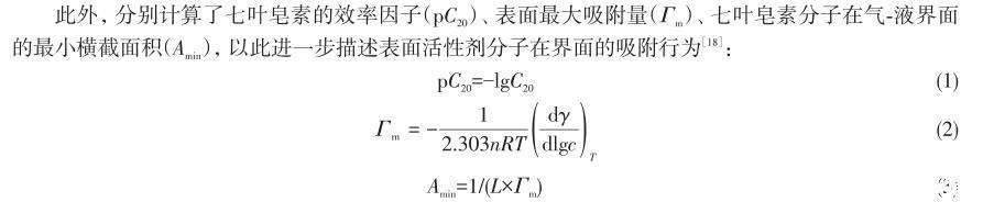 此外,分别计算了七叶皂素的效率因子(pC20)、表面最大吸附量(Γm)、七叶皂素分子在气-液界面的最小横截面积(Amin),以此进一步描述表面活性剂分子在界面的吸附行为: