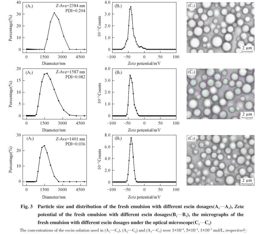 首先使用激光粒度仪表征了新制乳液的粒径大小及分布情况,如图3(A1)~(A3)所示.随着七叶皂素浓度从1×10-4mol/L增大到1×10-3mol/L,乳液平均粒径Z-Ave从约2.4μm下降至1.4μm,单分散系数(PDI)逐渐降低,粒径分布范围逐渐变窄,表明乳液稳定性得以提高.光学显微镜表征结果[图3(C1)~(C3)]也印证了该结论.