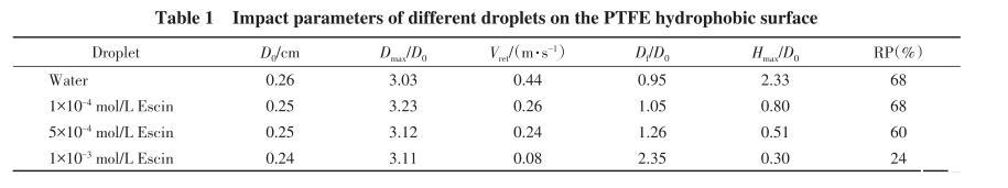 从图5(B)和(C)及表1可以看出,不同液滴在疏水表面上发生撞击后均发生相似程度的铺展,之后发生回缩.水滴回缩速率(0.44 m/s)较大,且回缩百分比达到68%.向水中加入少量七叶皂素,浓度为1×10-4mol/L时,回缩速率(0.26 m/s)明显降低,但回缩百分比没有明显改善.随着七叶皂素浓度增大,液滴回缩明显减弱.浓度为1×10-3mol/L时,回缩速率低至0.08 m/s,且仅液滴的24%发生回缩,可以认为达到了很好的抑制回弹的效果.而考察弹跳情况时发现,水滴因完全弹起离开表面,所以Hmax/D0最高达到2.33.与之相比,七叶皂素加入后,明显抑制了液滴的弹起,且随着浓度增大,抑制作用明显增加.
