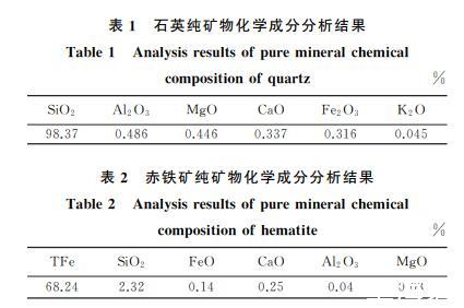 由表1可知,石英纯矿物样品中SiO2含量为98.37%,样品中含有少量Al、Mg及其他微量元素,因此石英样品可视为纯矿物,满足试验要求。由表2可知,赤铁矿中TFe含量为68.24%,样品中含有少量Si及其他微量元素,杂质含量较少,因而赤铁矿样品可视为纯矿物。