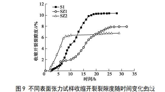 图9不同表面张力试样收缩开裂裂隙度随时间变化曲线