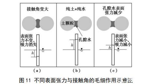 3.1接触角和表面张力抑制膨胀土裂隙发育的机理分析从前面的试验可知,减小孔隙水表面张力或增大土颗粒与孔隙水间的接触角都可以抑制膨胀土的干缩开裂,然而,增大接触角对膨胀土收缩开裂的抑制效果明显好于减小孔隙水表面张力。结合图11的颗粒模型和毛细管模型对其机理进行分析。当土颗粒间由液桥连接时(对应于非饱和土中的水封闭状态),其基质吸力为1 21 1r r。(3)式中为液体的表面张力,r1和r2是任意一对相互垂直的平面在液面上所截取曲线的曲率半径,当曲率中心在液体侧时其值为“负”,反之为“正”。设为“正”时表示吸引,为“负”时表示排斥。传统的非饱和土力学中,基质吸力都大于零,不会是负值。这是因为:在岩土工程领域中,通常把岩土体都视为完全亲水性材料,即孔隙水与土颗粒的接触角为0,即使在模型计算时所涉及的接触角也是比较小的,这种情况下基质吸力只可能为正,即:非饱和土中只存在负的孔隙水压力。