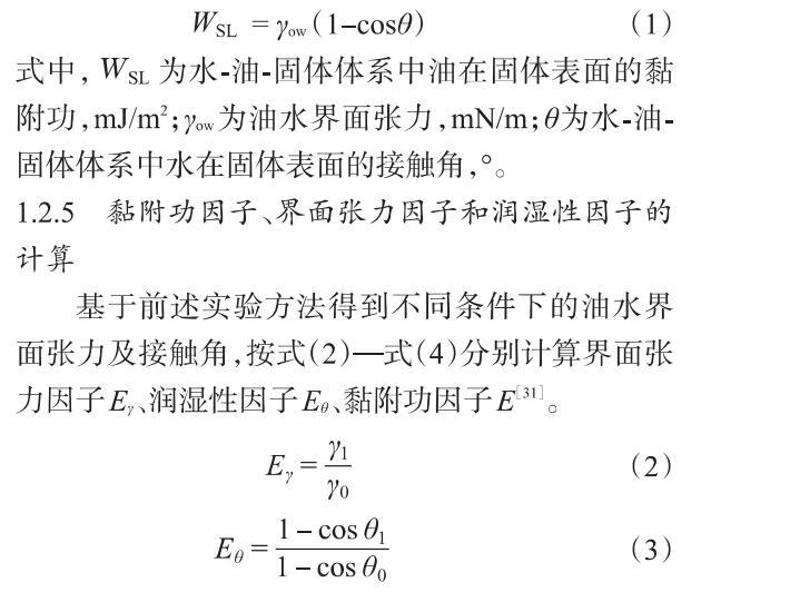 式中,WSL为水-油-固体体系中油在固体表面的黏附功,mJ/m2;γow为油水界面张力,mN/m;θ为水-油-固体体系中水在固体表面的接触角。
