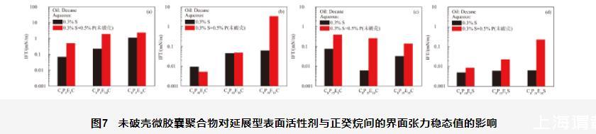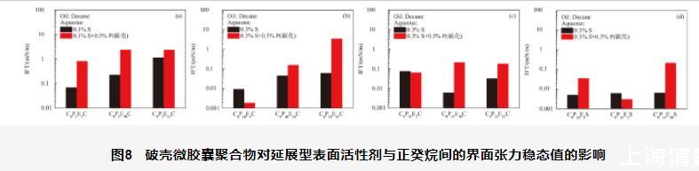 图8破壳微胶囊聚合物对延展型表面活性剂与正癸烷间的界面张力稳态值的影响