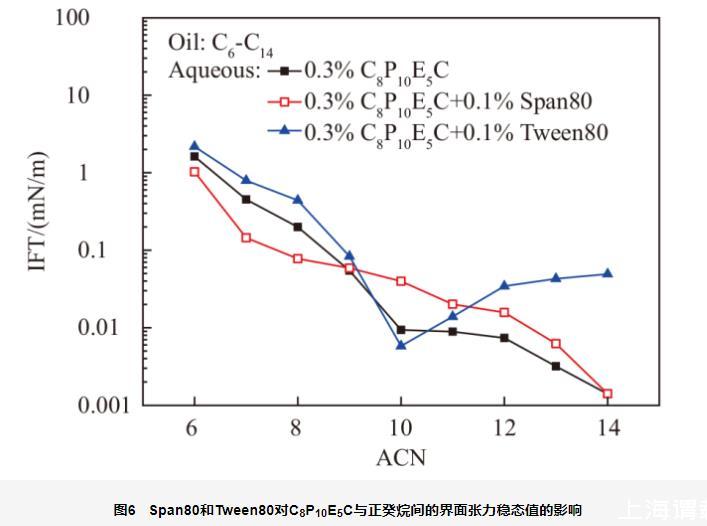 从图中可以看出,由于Span80是油溶性很强的非离子表面活性剂,其在水中溶解性不好,只能与C8P10E5C分子形成混合胶束。因此,Span80不会影响C8P10E5C的亲水亲油平衡,表现为混合体系的nmin值与单独C8P10E5C相似。同时,Span80会分配到油相中,然后从油相一侧向界面吸附。这就造成油相烷烃碳数较低、界面张力较高时,Span80通过混合吸附,轻度降低界面张力;而当油相烷烃碳数较高、界面张力较低时,Span80通过竞争吸附,造成界面张力略有升高。但总体而言,油溶性非离子表面活性剂对界面张力影响不大。