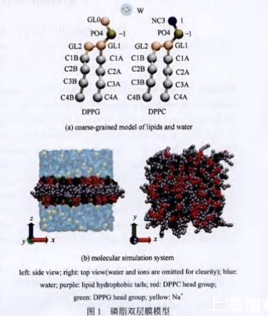 采用Marrink等开发的Martini粗粒化力场,整个模拟系统包含粗粒化的磷脂分子、粗粒化的水粒子和用于平衡体系电荷的离子。磷脂分子的模型如图1(a)所示,DPPG和DPPC磷脂分子均由12个粗粒化粒子组成。其中,DPPC分子极性头部含有一个带正电的胆碱基团(NC3)粒子、一个带负电的磷酸基团(PO4)和两个中性的甘油骨架(GL1,GL2),总净电荷为0;而DPPG分子极性头部含有一个中性的甘油基团(GL0)、一个带负电的磷酸基团(PO4)和两个中性的甘油骨架(GL1,GL2),总净电荷为−1e。DPPG和DPPC磷脂分子的两条疏水尾均分别由4个疏水性的粒子组成,每个粒子代表实际的磷脂分子尾部的3个甲基或亚甲基。Martini力场中,4个水分子被粗粒化为1个粗粒化粒子,符号为W。模拟过程中用于维持模拟体系电中性的离子为粗粒化钠离子(Na+),包括钠离子及其水合分子,带有+1e的正电荷,直径为0.47 nm。