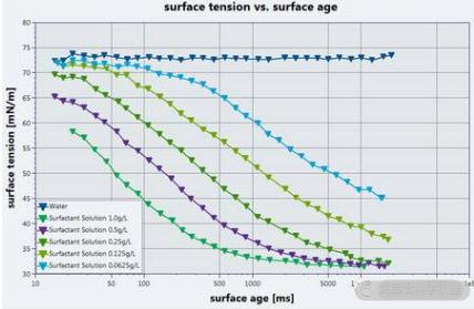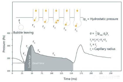 测量结果对应的是一定表面年龄下的表面张力,表面年龄为从气泡开始产生到最大压力之间的时间。表面张力对表面年龄的关系可以通过不同的鼓泡速度测出。