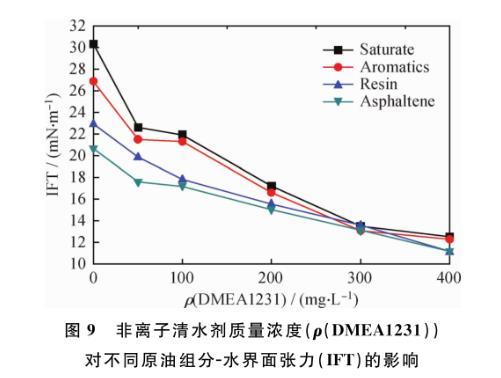 图9非离子清水剂质量浓度(ρ(DMEA1231))对不同原油组分-水界面张力(IFT)的影响