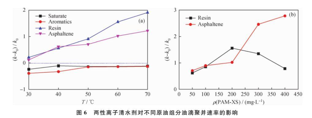 图6两性离子清水剂对不同原油组分油滴聚并速率的影响