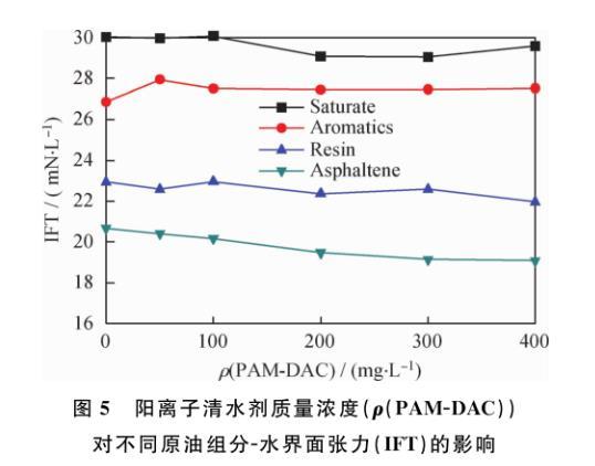 图5阳离子清水剂质量浓度(ρ(PAM-DAC))对不同原油组分-水界面张力(IFT)的影响